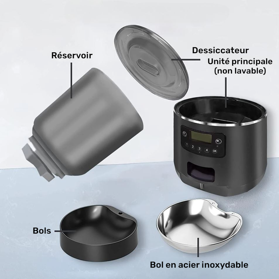 -Fonctions principales : Programmation des repas, double alimentation, anti-bourrage, anti-insectes, facile à nettoyer